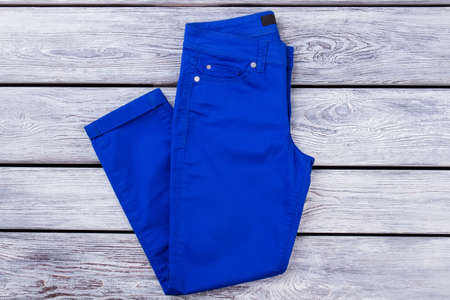 Blue folded trousers. Top view, flat lay. Grey wooden desk surface background.