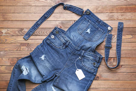 Stylish jeans jumpers on wooden background