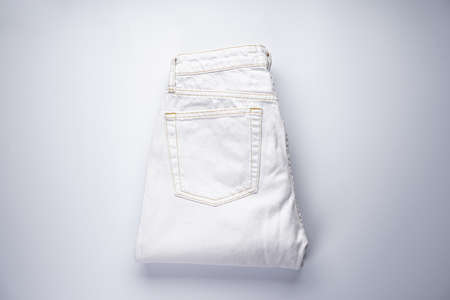 White folded denim pants, back pocket, flat lay.