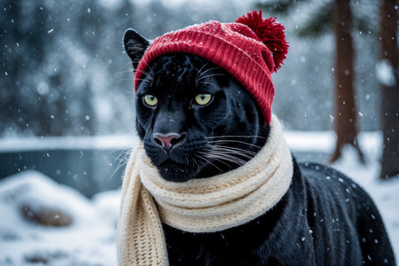 AI Generative Panther portrait in knitted winter clothes hat and scarf, animal in snowfall in winter