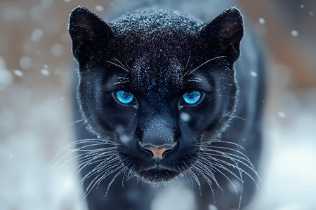 A stunning black panther prowls through a snowy wilderness, its intense blue eyes contrasting against the white backdrop. the snow-dusted fur and piercing gaze evoke mystery and power in this captivating wildlife portrait. Generative AI