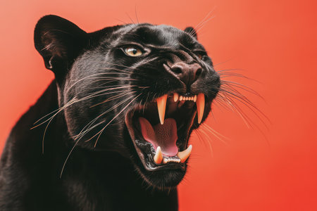 Powerful panther mid-roar with fierce expression and wide-open mouth, highlighting strength and primal instinct on a bold backdrop.