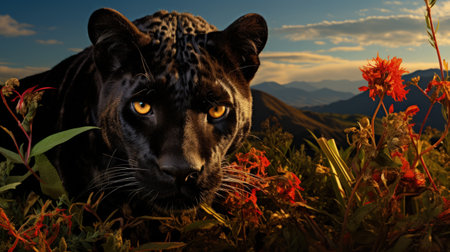 Up close and personal with black panther puma, natural habitat. Showcasing fierce and serious gaze as wild predator in exotic natural world. Animal themes wildlife concept. Copy ad text space. Gen Ai