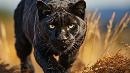 An AI generated illustration of A magnificent black panther walking through tall grass in the fading light of dusk