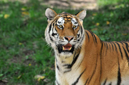 Amur Tigers on green grass in summer day
