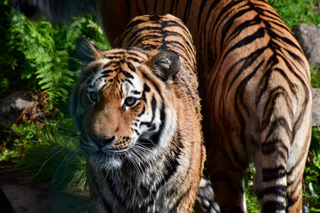 Two tigers at Kristiansand Zoo, Norway.. One tiger facing camera, one facing the other way.