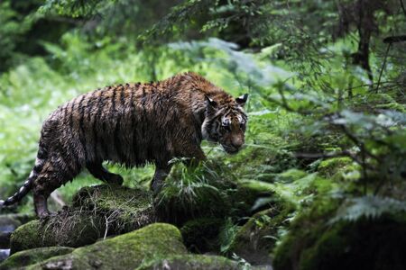 The Siberian tiger (Panthera tigris tigris) or Amur tiger (Panthera tigris altaica) in the forest. Tiger with green background. Tiger on a stone. |