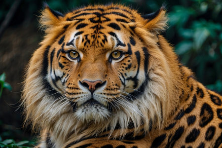 Close-up Portrait of a Majestic Tiger with Striking Features Against a Lush Green Background