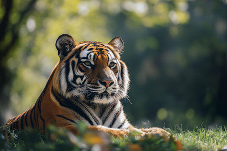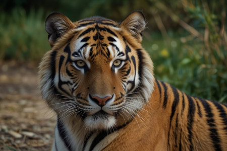 Close up of a majestic tiger, displaying its vibrant orange fur and distinctive black stripes. The animal gazes calmly, surrounded by a lush green environment, highlighting its powerful presence.