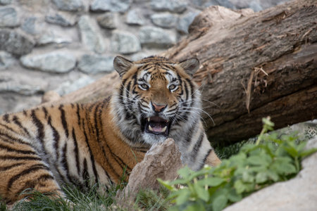 Close up portrait of one young Siberian tiger (Amur tiger, Panthera tigris altaica) looking at camera with mouth open, low angle view