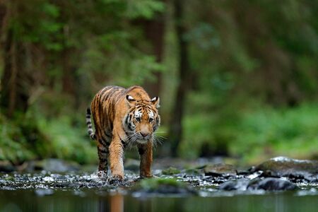 Amur tiger walking in river water. Danger animal, tajga, Russia. Animal in green forest stream. Grey stone, river droplet. Siberian tiger splash water. Tiger wildlife scene, wild cat, nature habitat.
