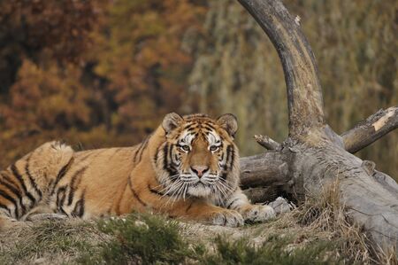 Siberian tiger laying near a tree trunk