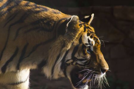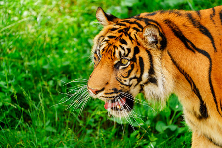 A tiger looking to the right,side profile, jaw open