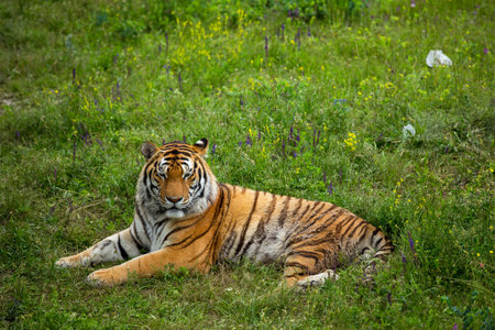 The Siberian Tiger (Panthera tigris Tigris) or Amur Tiger (Panthera tigris altaica) in the grassland. Tiger with green background. Tiger hidden in flowers.