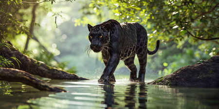 Black panther in a dark forest lake with AI generated.