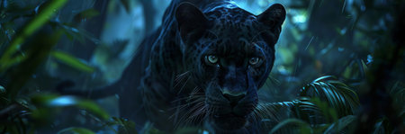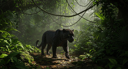 Stealthy Black panther tropical forest walk. Mammal fur. Generate Ai