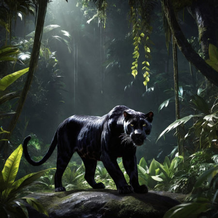 A black panther prowling silently through the jungle at dusk, eyes shining with determination