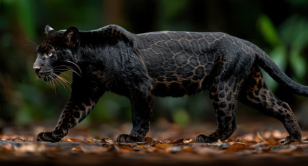 Majestic black leopard stalking through the forest