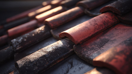 A close-up image of weathered terracotta roof tiles showcasing rich textures and warm colors, highlighting the beauty of traditional architecture under soft light.