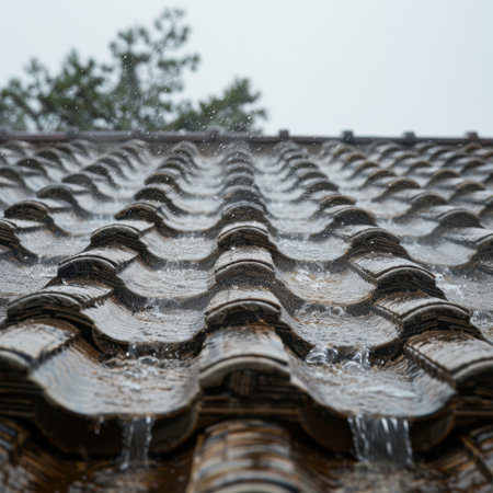 Water flows down the textured surface of traditional roof tiles, capturing a tranquil moment during rain. The natural beauty highlights craftsmanship and atmospheric elements.