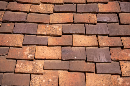 Orange old brick background on the roof. The background is evenly arranged with dry moss clinging to the surface. Old, symmetrical background image icons.