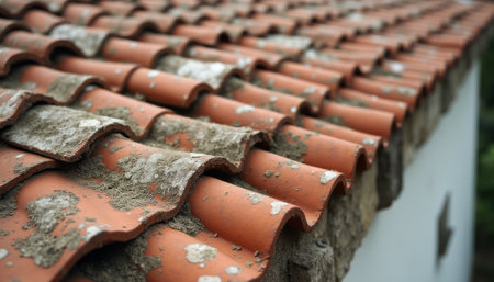 A close-up view of weathered terracotta roof tiles, showcasing their rustic charm and natural aging. The image captures the intricate textures and earthy tones, highlighting the beauty of nature reclaiming the surface.