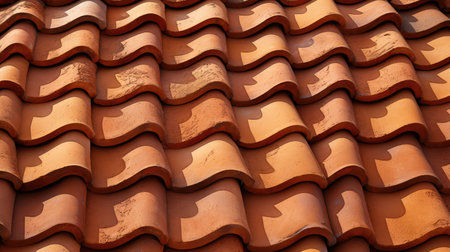 A close-up view of terracotta roof tiles, showcasing intricate textures and natural color variations. The image highlights architectural beauty and craftsmanship.