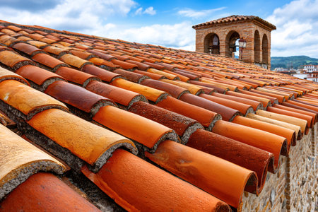 A stunning view of a classic terracotta roof against a vibrant blue sky. The image captures intricate tile patterns, showcasing traditional architecture and rustic charm.