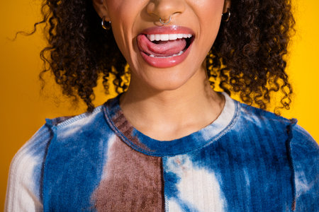 Cropped close-up view portrait of her she nice attractive crazy cheerful cheery, woman showing tongue grimacing healthy oral cavity isolated over pink pastel color background