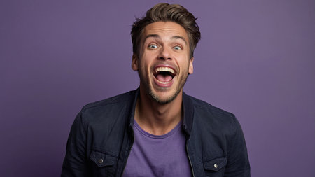 A young man expresses pure joy while laughing heartily, showing his carefree spirit. The vibrant purple backdrop enhances the uplifting mood, creating a lively and engaging atmosphere