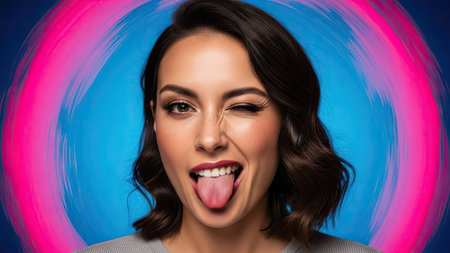 A woman is playfully winking and extending her tongue, set against a dynamic background of blue and pink circular design. The image showcases a close-up shot with soft, flattering lighting enhancing the subject's features. This image could be suitable for various commercial or editorial applications needing visual appeal.
