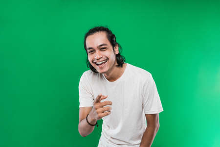 handsome man with long black hair Asian laughing happily while pointing at camera on a green background