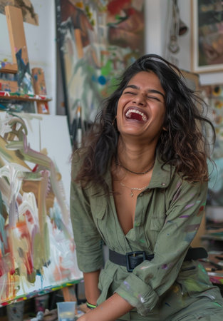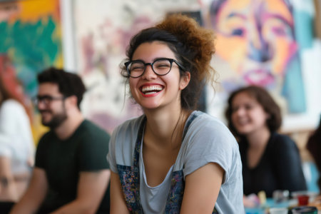 Joyful group of artists sharing laughter during a creative session in a vibrant studio filled with colorful artwork
