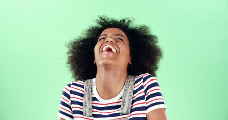 Black woman, laughing and funny joke with comic in studio, humor or hilarious with happy reaction. Crazy, silly or African female person in comedy with space for positive emotion on green background