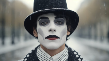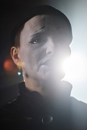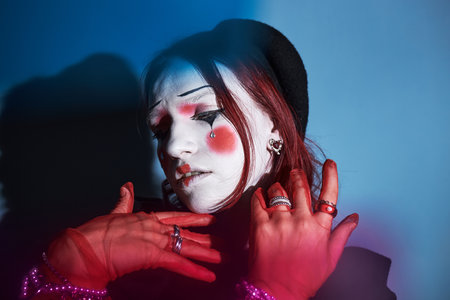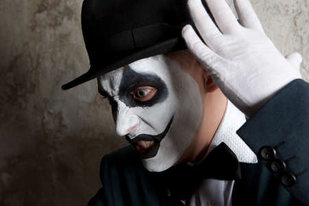 Dramatic closeup portrait of sad mime artist performing on stage with backlight