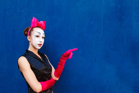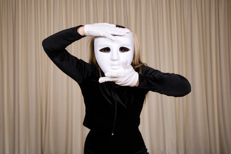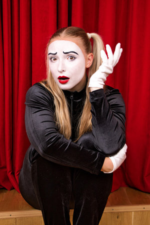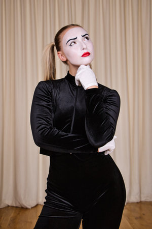 Close-up portrait of a beautiful mime girl in a black dress and white gloves, with a sad look.
