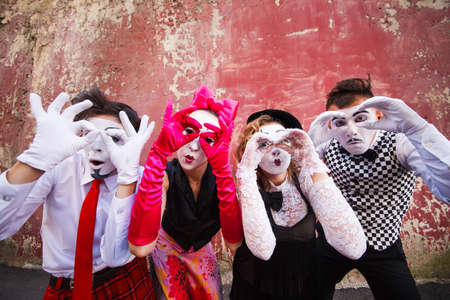 Two French mimes in Paris. Funny comedy street performers with white makeup face. Generate ai