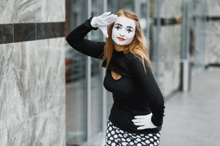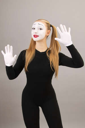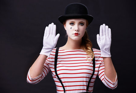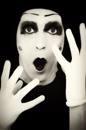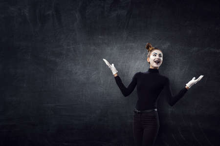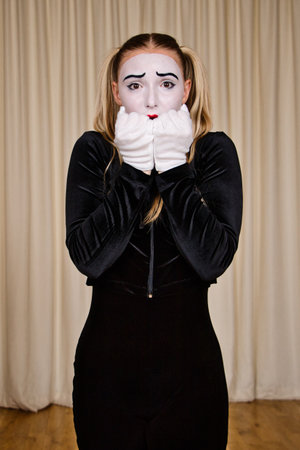 Portrait of a female mime in a black dress and white gloves, emotion of fear close-up.
