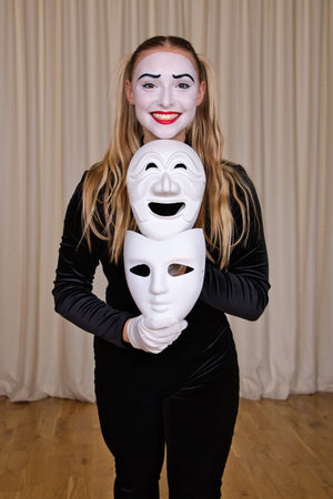 The focus is on a smiling mime artist with masks in her hands. Close-up portrait.