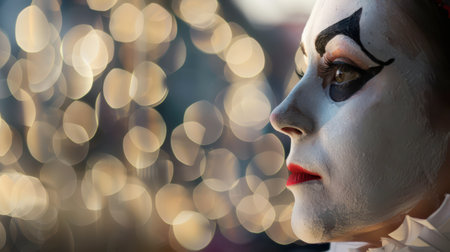 A close-up portrait captures a woman's face, adorned with white face paint, black eyeliner, and bright red lipstick, against a blurred background of shimmering lights. She gazes thoughtfully towards the right side of the frame.