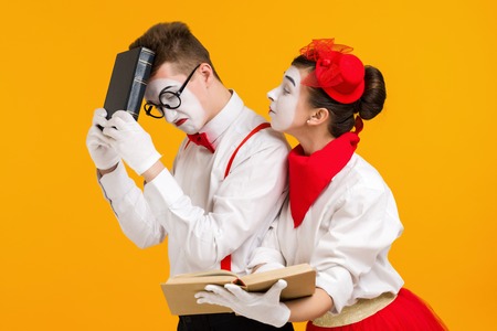 mime couple artist with book isolated on yellow background. woman teaches man. man does not want to learn