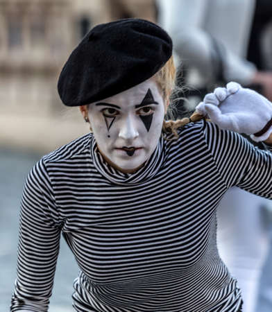TIMISOARA, ROMANIA - MARCH 31, 2017: Pantomime girl with painted face, present on the street inside the CheckART Carnival organized by the City Hall Timisoara. Union Square.