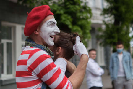 Zhytomyr, Ukraine - May 15, 2021: Professional mime artist performing different emotions and interacts with people. Mime dances with woman