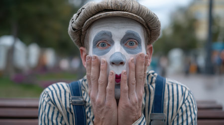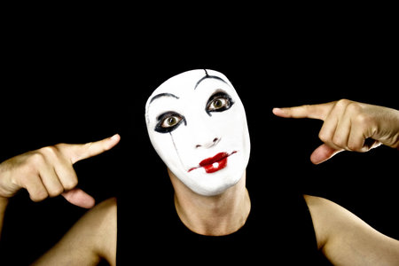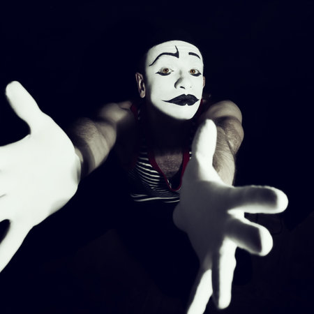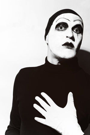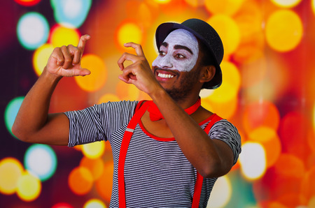 Pantomime man wearing facial paint posing for camera, using hands interacting body language, blurry lights background.