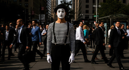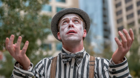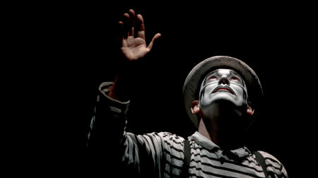 A mime artist performs under a spotlight, expressing emotions through gestures. The intricate face paint adds to the captivating and silent storytelling.