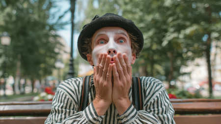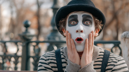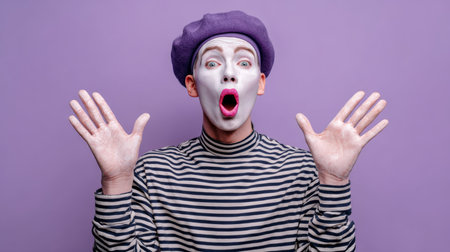 A surprised mime artist showcases an expressive face with vibrant makeup against a purple background. The artist captures a moment of joy and creativity through unique gestures.