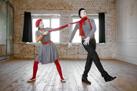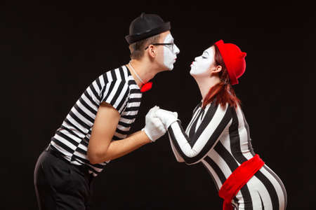 Portrait of two mime artists performing, isolated on black background. Woman and man holding hands wanting to kiss