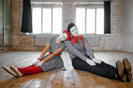 Close-up portrait of sad mime couple pitifully looking up and starting to cry, isolated on grey background with copy place