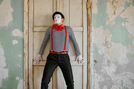 The clown in the role of pantomime shows a touch to an invisible wall. Close-up on a gray background.