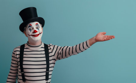 A man dressed as a mime, wearing a top hat and white face paint, smiles and gestures with his right hand towards an empty space against a light blue background.